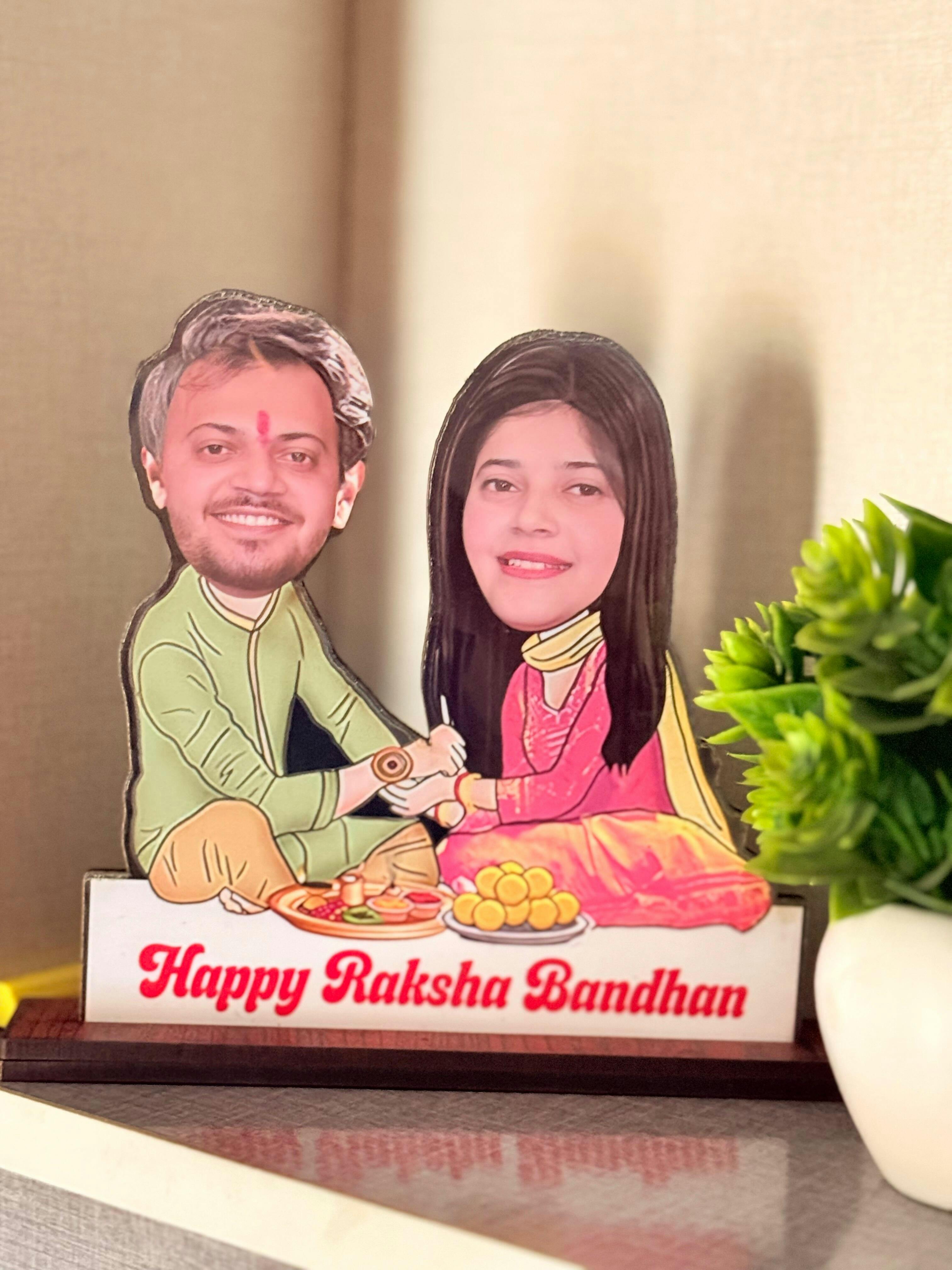 Make this Raksha Bandhan memorable with a personalized caricature of your brother and sister on a sturdy wooden stand. The stand is made of high-quality wood and is durable. It shows a brother and sister celebrating the rakhi-tying ceremony. The base of the caricature features the words 'Happy Raksha Bandhan,' adding a lovely touch to the caricature. Personalize the caricature with your favourite picture and make this a unique and heart-touching gift to celebrate your loving bond.